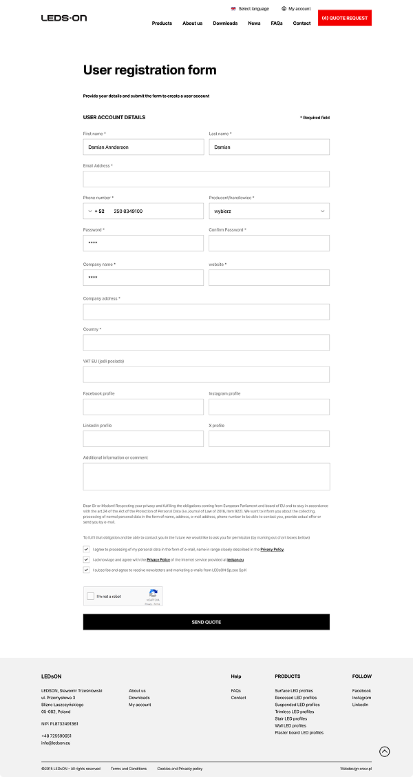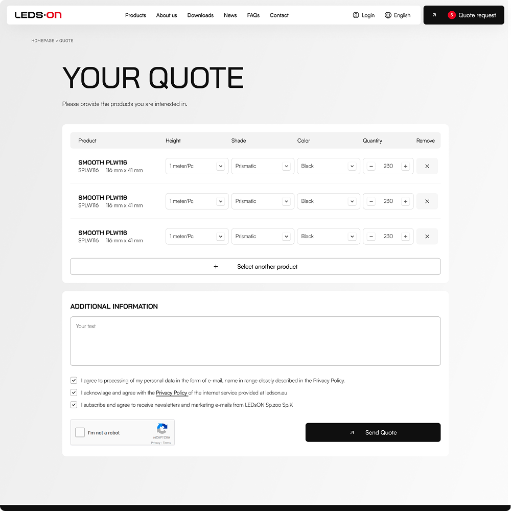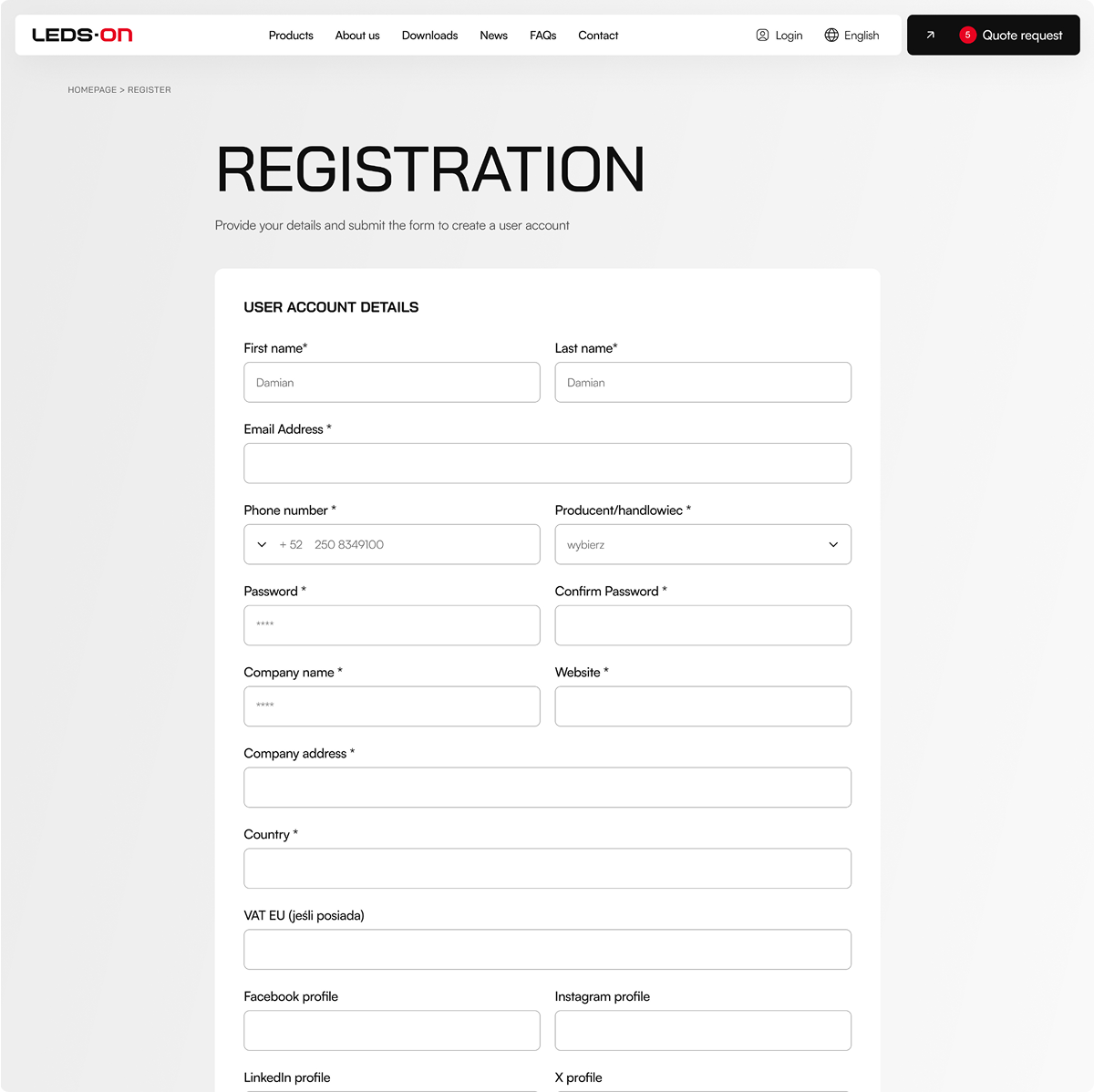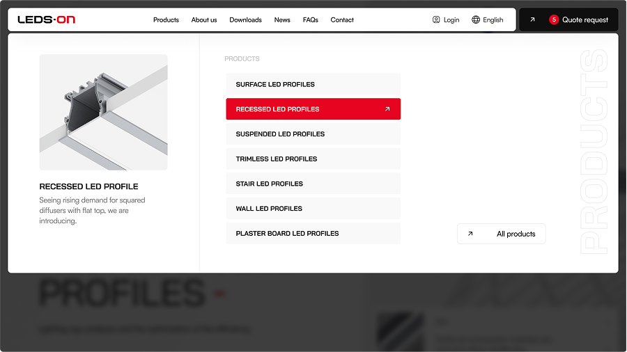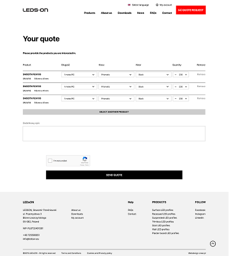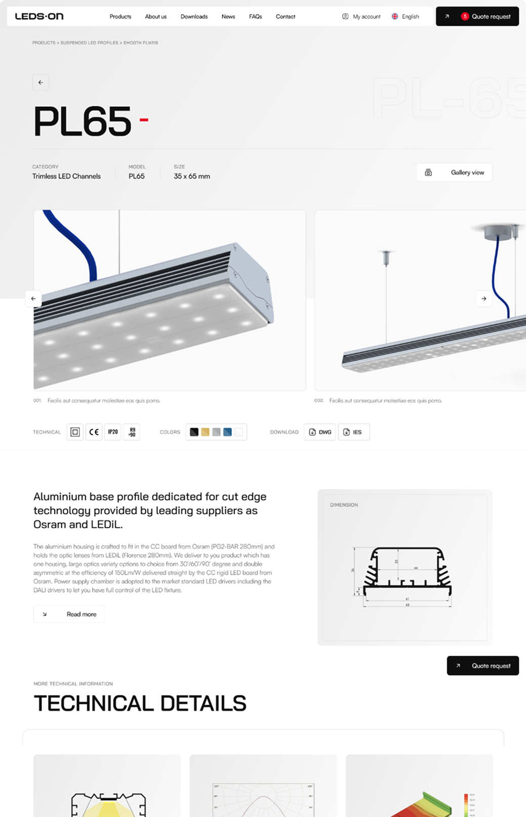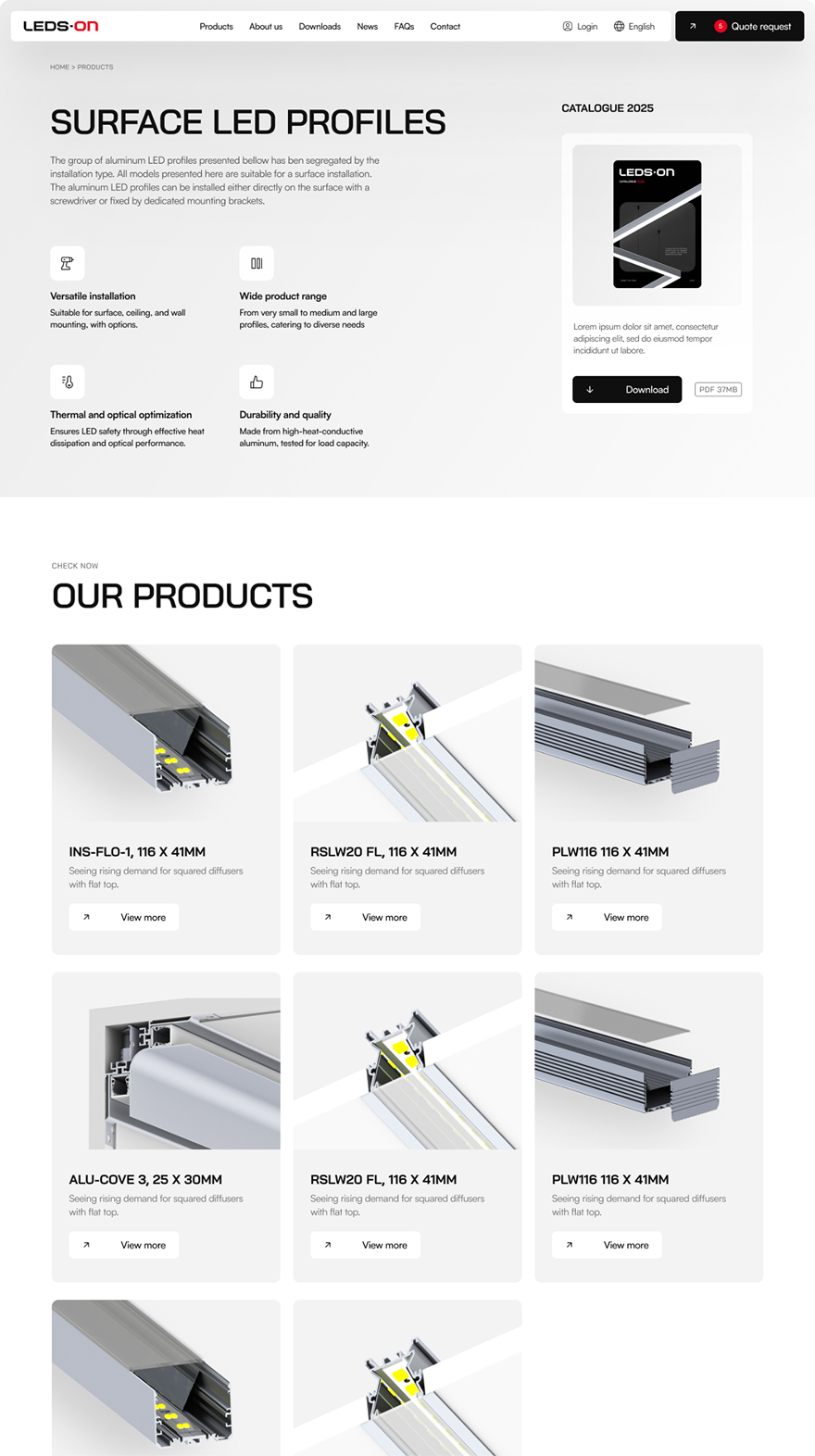 W procesie UX dla LEDSON postawiliśmy na funkcjonalność typu "Professional Support". Zaprojektowaliśmy ścieżkę użytkownika tak, aby maksymalnie skrócić czas potrzebny na znalezienie konkretnego rozwiązania oświetleniowego. Kluczowym elementem było stworzenie intuicyjnej sekcji wsparcia projektowego, gdzie inżynierowie mogą łatwo dotrzeć do usług OEM, gięcia profili czy obróbki CNC. System logowania i personalizacji treści pozwala na dostarczanie dedykowanych rozwiązań dla różnych rynków międzynarodowych, co buduje pozycję marki jako globalnego partnera w segmencie oświetlenia technicznego.