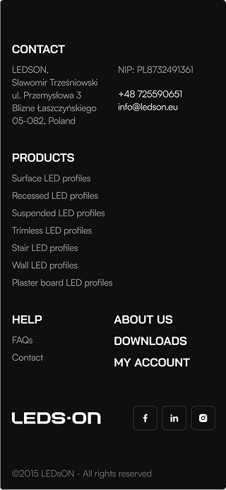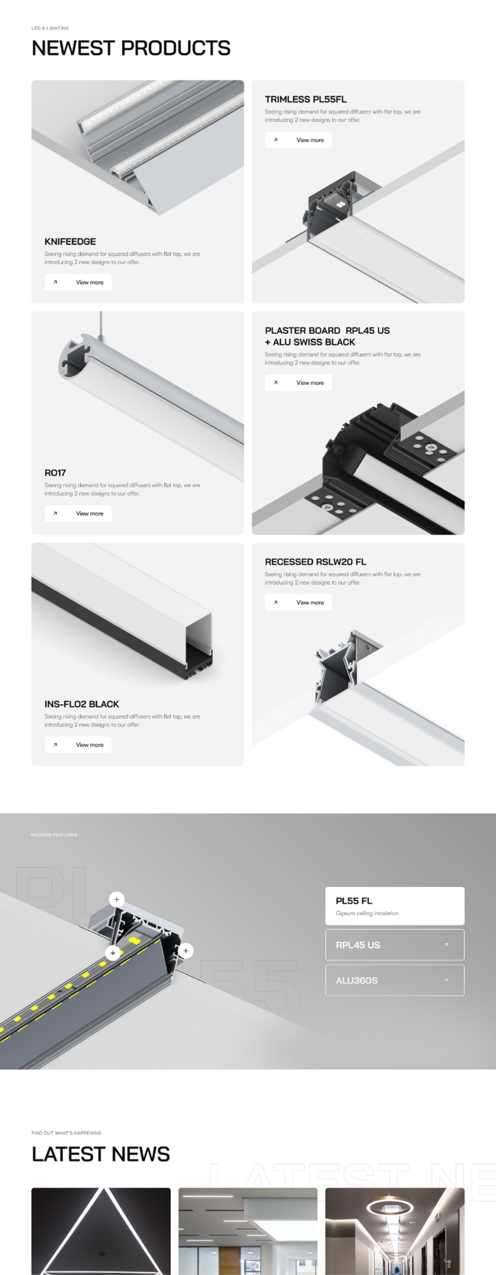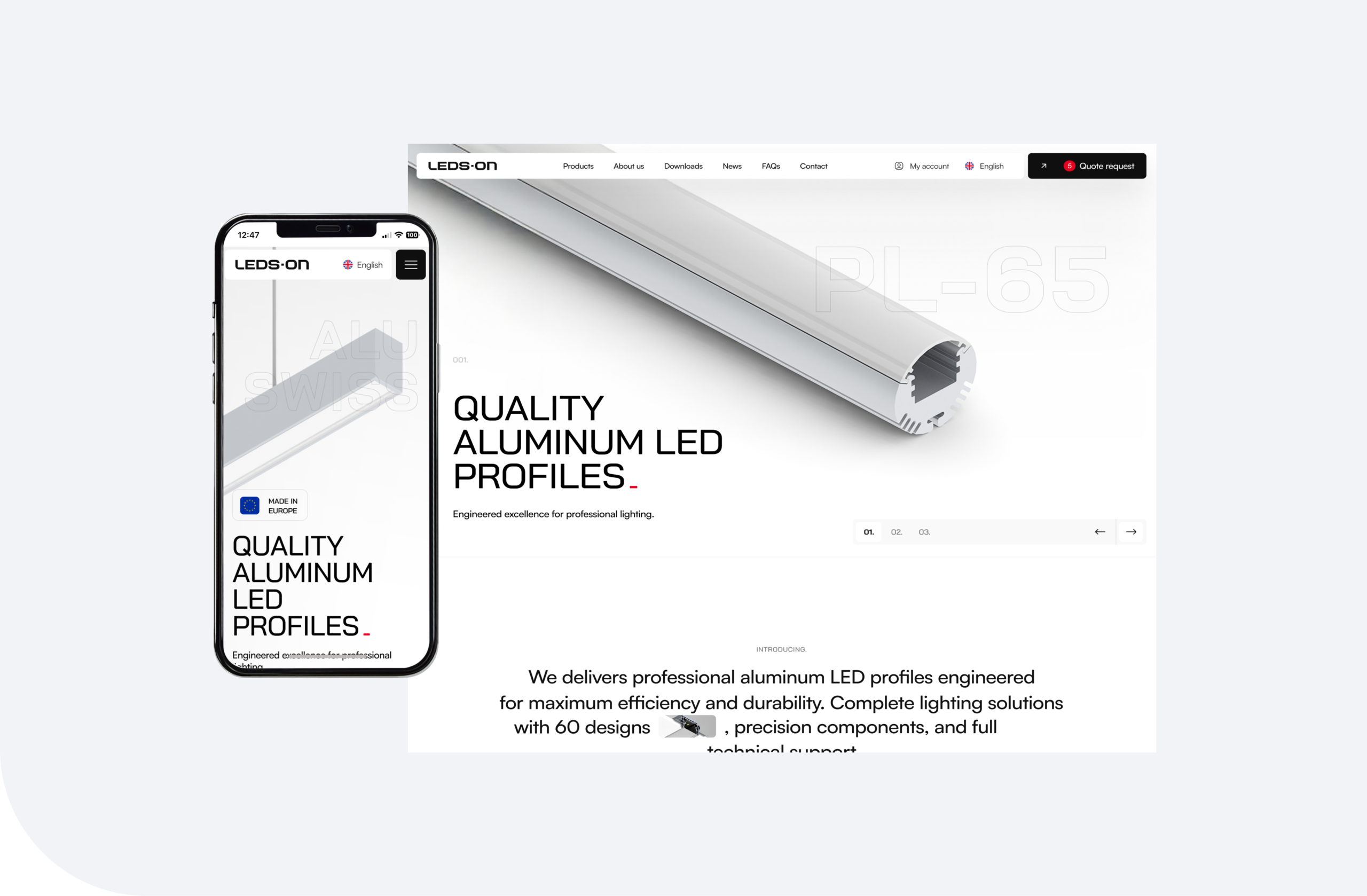 Warstwa wizualna serwisu oddaje charakter produktów LEDSON – jest surowa, precyzyjna i nowoczesna. Wykorzystaliśmy industrialną estetykę, która podkreśla trwałość aluminium i czystość światła. Design skupia się na detalach: makrofotografie tekstur anodowanych powierzchni oraz schematy techniczne są kluczowymi elementami budującymi zaufanie do jakości. Interfejs został zaprojektowany w sposób minimalistyczny, aby nie odciągać uwagi od merytorycznej zawartości, zachowując jednocześnie najwyższe standardy estetyczne nowoczesnych platform B2B.